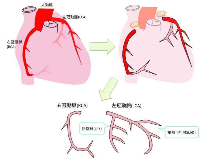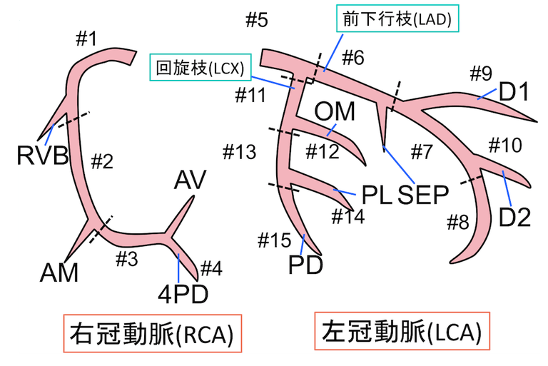 - 右冠動脈 (RCA): 1番〜4番。下壁・後壁を栄養。