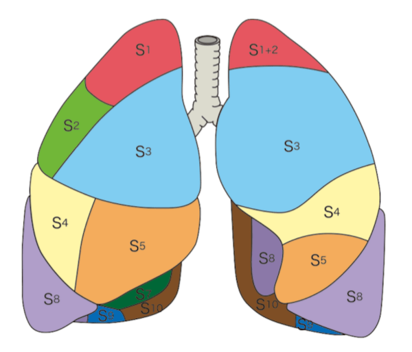 気管支鏡やCTで必須。「右肺は3葉10区域、左肺は2葉8区域」。 特にS6(下葉の上の方)は誤嚥性肺炎の好発部位として有名![3]