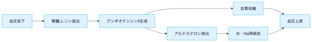 - さらにアルドステロン(副腎皮質)が出て、ナトリウムと水をキャッチ! 結果として血圧が上がる。この一連の「レニン・アンギオテンシン・アルドステロン系」は、循環器の治療の要だよ。