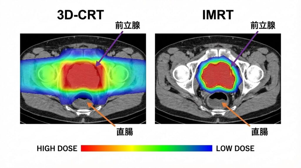 IMRTにより、腫瘍に高線量を集中させながら、周囲の正常組織(直腸、膀胱、唾液腺など)への被ばくを大幅に低減できるようになりました。