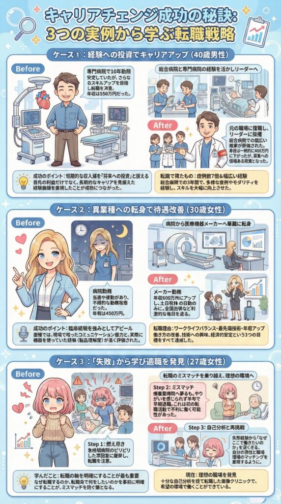 ただし!長期的なキャリアを考えると、一時的な年収ダウンは「投資」と考えることもできます。総合病院で幅広い経験を積んでから、また専門病院に戻るというキャリアパスもありですよね。