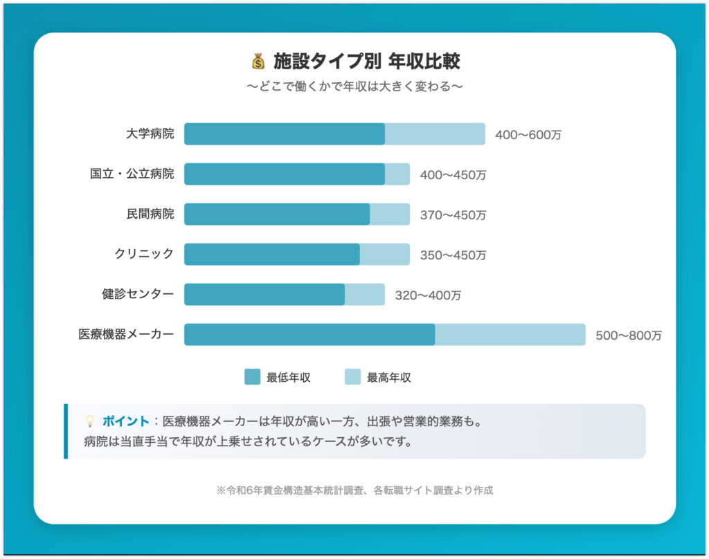 - 年収は施設タイプで大きく異なる。医療機器メーカーなら500万〜800万円も