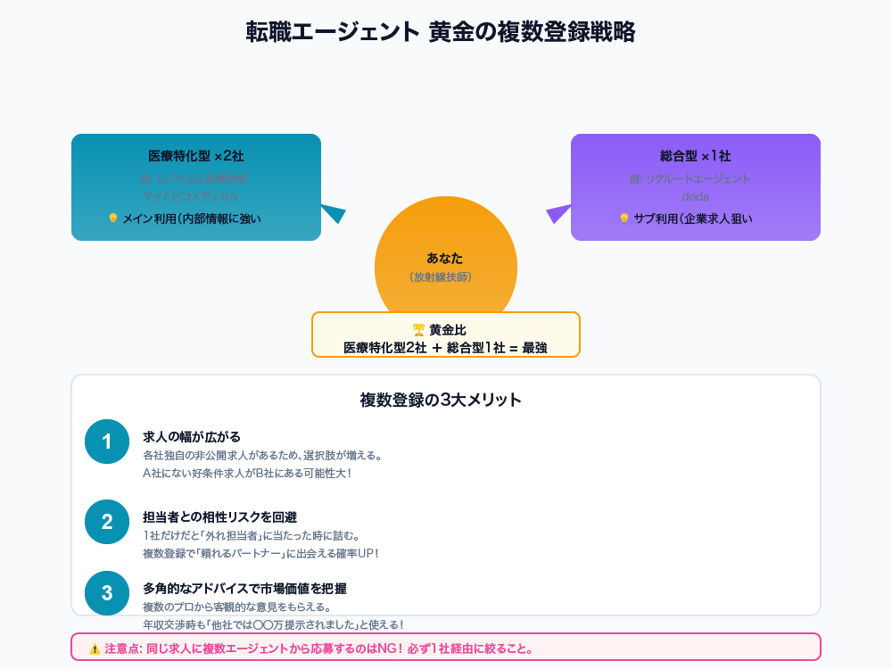 【黄金比率】医療特化型 2社 + 総合型 1社 まずはこの組み合わせでスタートし、相性の良いエージェントに絞っていくのが効率的です。