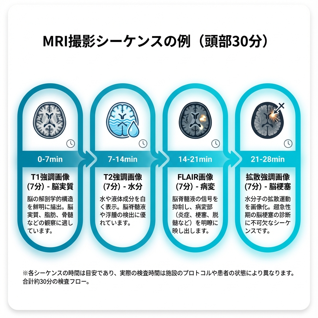 同じ部位でも、T1 強調画像、T2 強調画像、拡散強調画像…と複数の撮影法を組み合わせます。