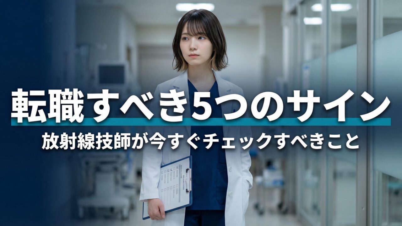 転職を検討すべき5つのサインは、①給与が市場相場を下回っている、②モダリティが固定されスキルアップが止まっている、③当直・残業でQOLが破壊されている、④人間関係が閉鎖的でハラスメントがある、⑤将来のキャリアパスが見えない、の5つ。1つでも当てはまったら、まず情報収集から始める価値がある。
